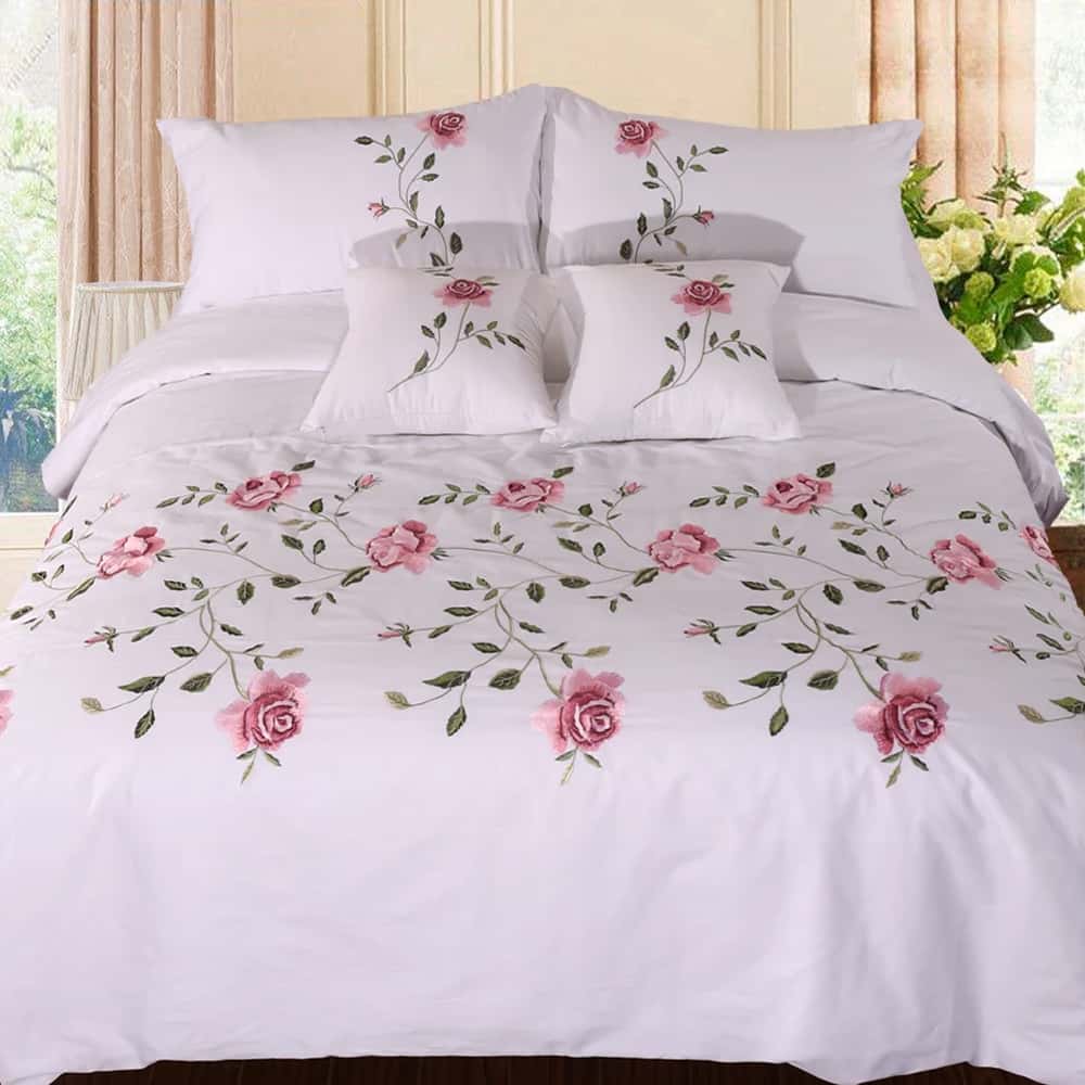 Include 8 Piece set: 1 Bedsheet 1 Quilt cover (emb) 2 pillow cover (emb) 2 pillow sham covers, 2 cushion covers