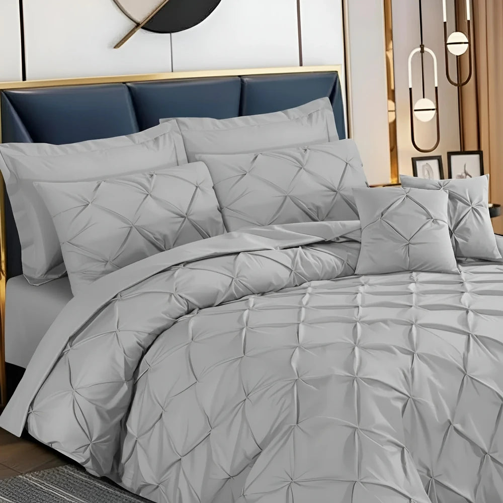 Upgrade your bedroom with our Premium Pintuck Duvet Set, designed for sophistication and comfort. This 8-piece set includes: